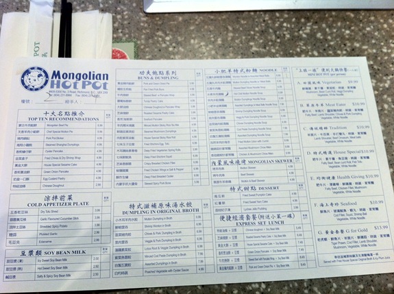 The Mongolian Hot Pot menu is one that you fill out by checking the order sheet.